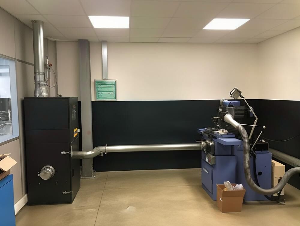 Progettiamo cappe e punti di presa su stazioni critiche (taglio, levigatura, travaso, macinazione), convogliando l’aria nella rete canalizzata che alimenta il filtro centrale.